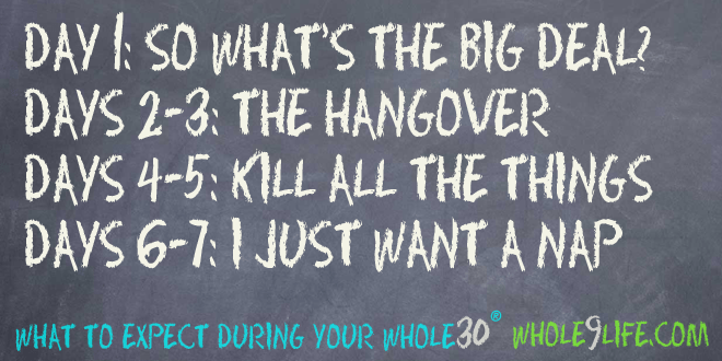 - This website is also GREAT, I looked at just about every day and if it wasn’t spot on, it was close. It’s a timeline of how you may be feeling each day – an example: Days 8 & 9, you may experience bloating, etc. (which I did) and that is normal. So reassuring! And sorry for the overshare but just being up front with you guys. Here’s the link: https://whole30.com/revised-timeline/