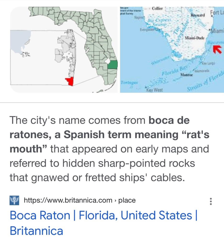 You might be thinking … boca raton…wouldn’t that mean rat’s mouth??! Surely nobody would name a city after the mouth of a rat. In fact, they did :
