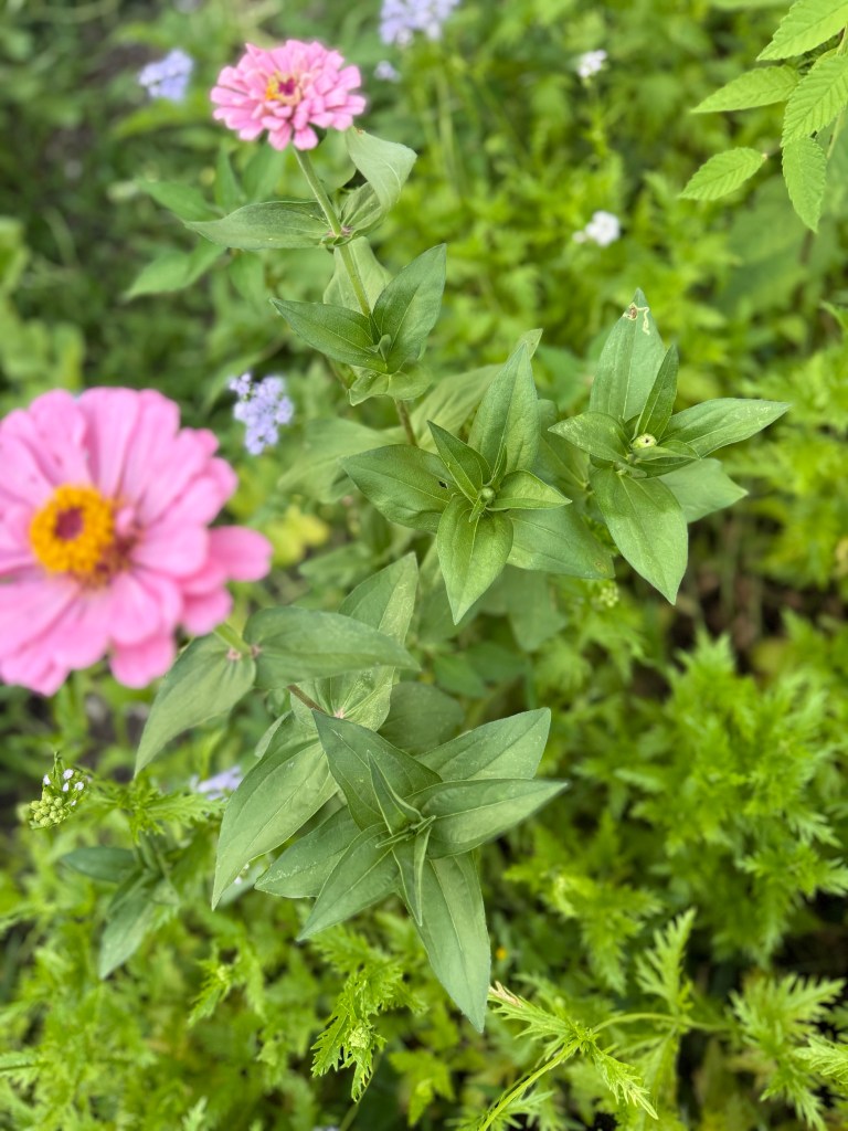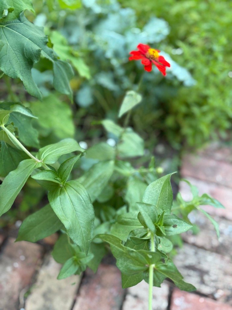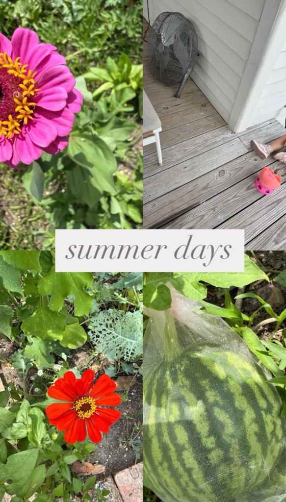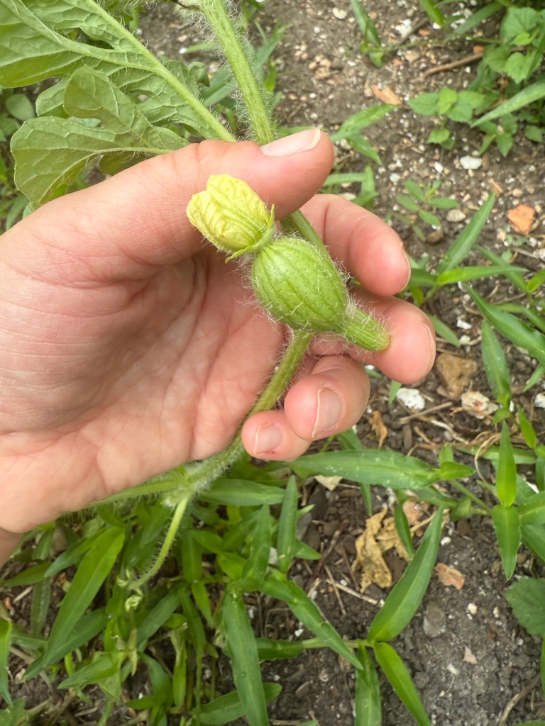 We planted seeds again this spring, and we have one gorgeous watermelon growing, as well as zinnias, wildflowers and kale.