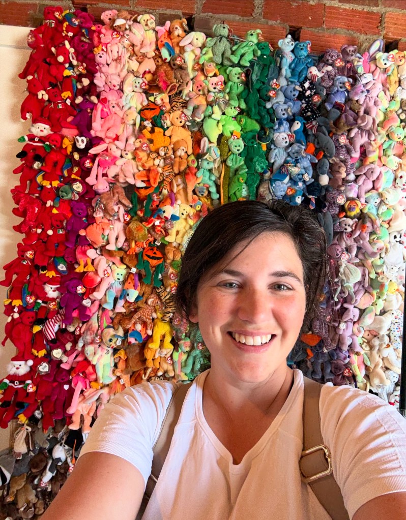 We spent about 15 or 20 minutes looking at everything, then she played with some toys in an open area in the back, while I posed in front of a wall of Beenie Baby toys: